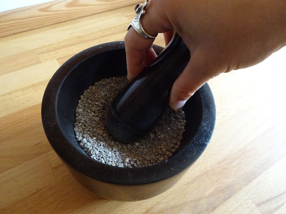 - Katzenstreu mit einem Mörser zerstoßen.