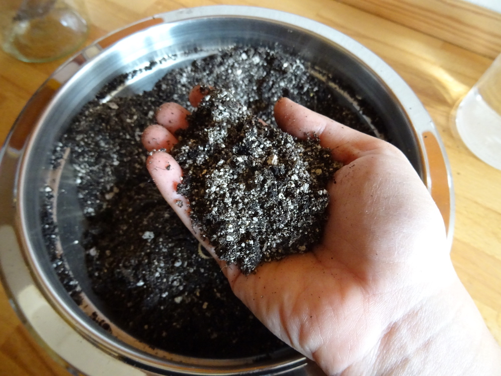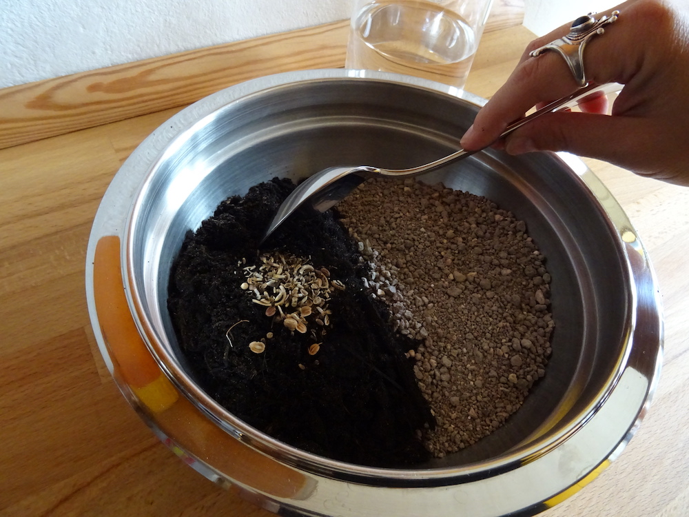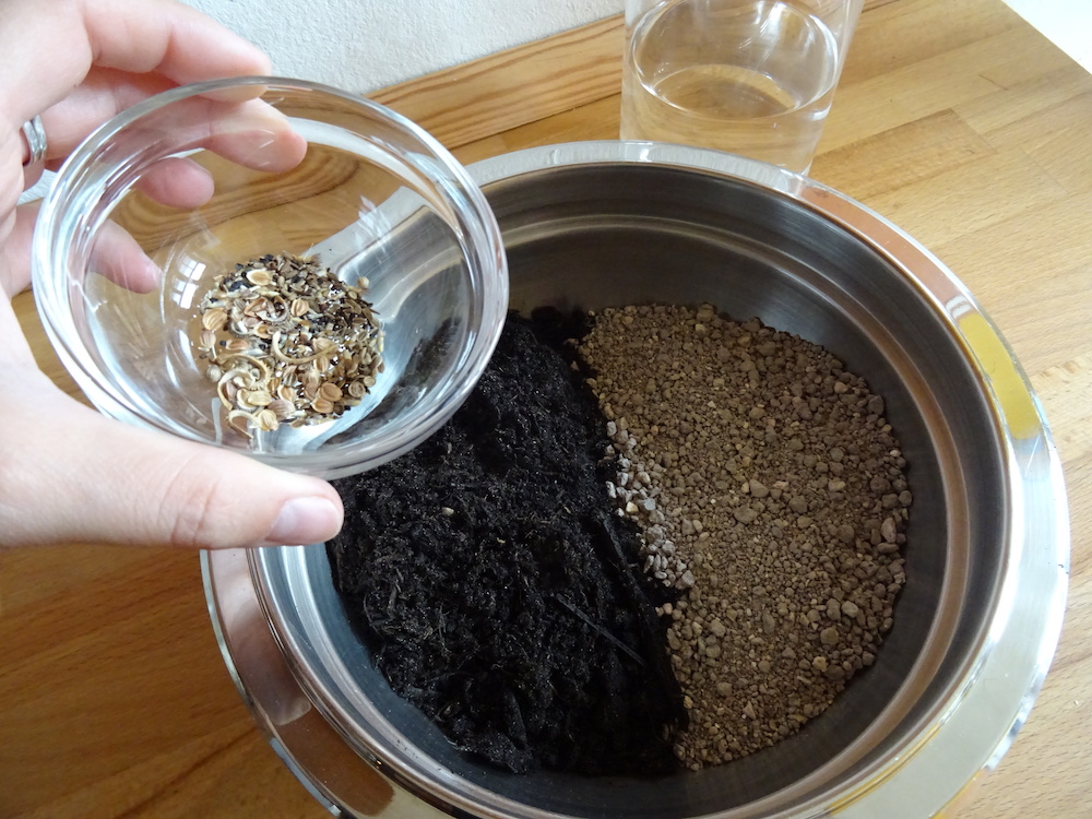 - Zu gleichen Teilen Erde und Katzenstreu mit dem Saatgut mischen.