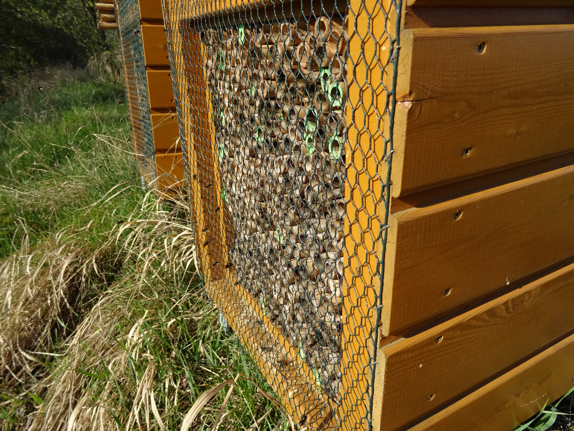 Es summt und brummt rund um die Wildbienenhotels in den Fahner Höhen. Fleißig kriechen die kleinen Tiere in die Röhren der Nisthilfen und legen den gesammelten Pollen ab. Obwohl die meisten Obstgehölze noch nicht blühen, finden sie viele andere Gewächse deren Blüten für sie die Nahrung bereit halten.
