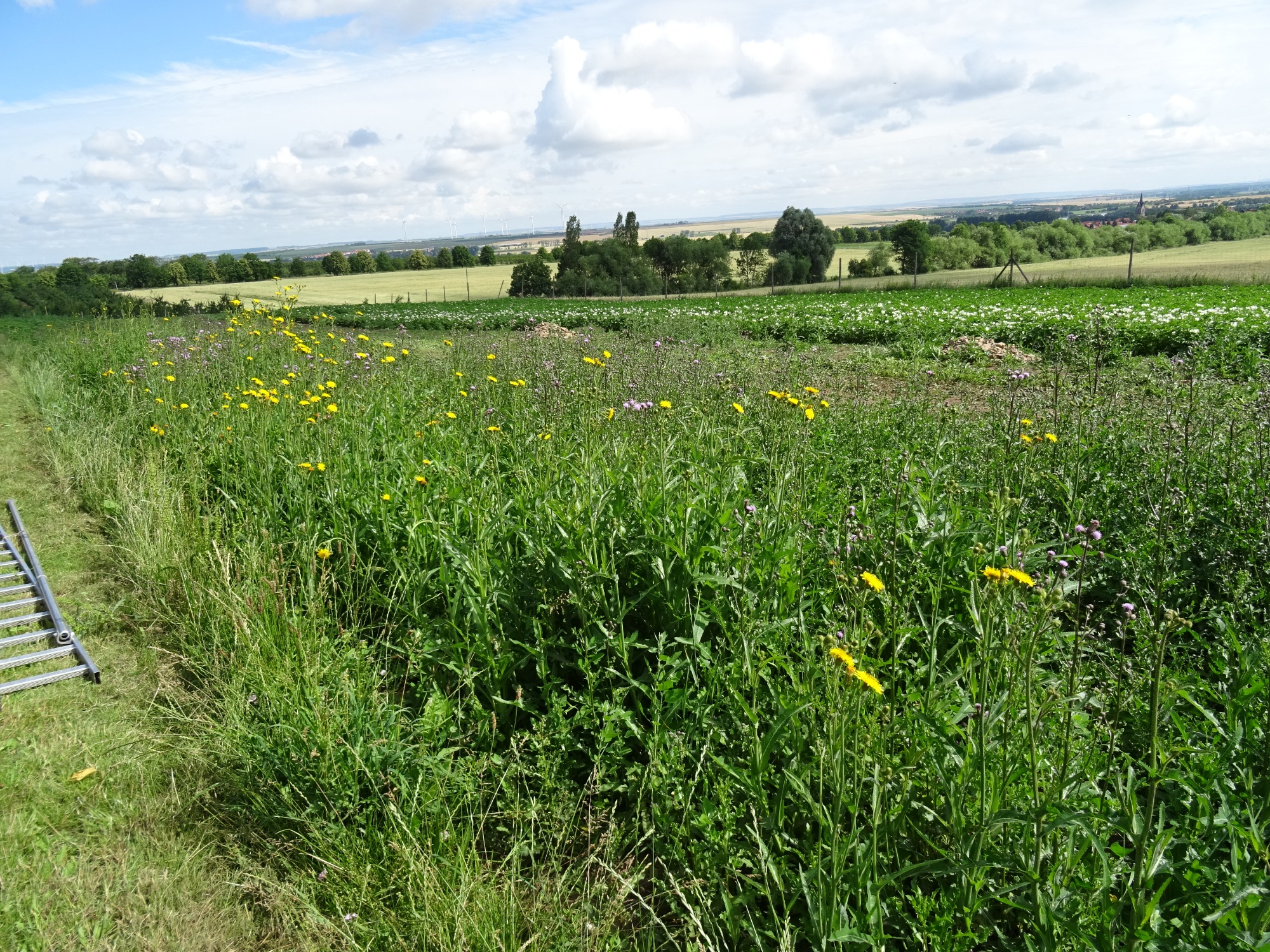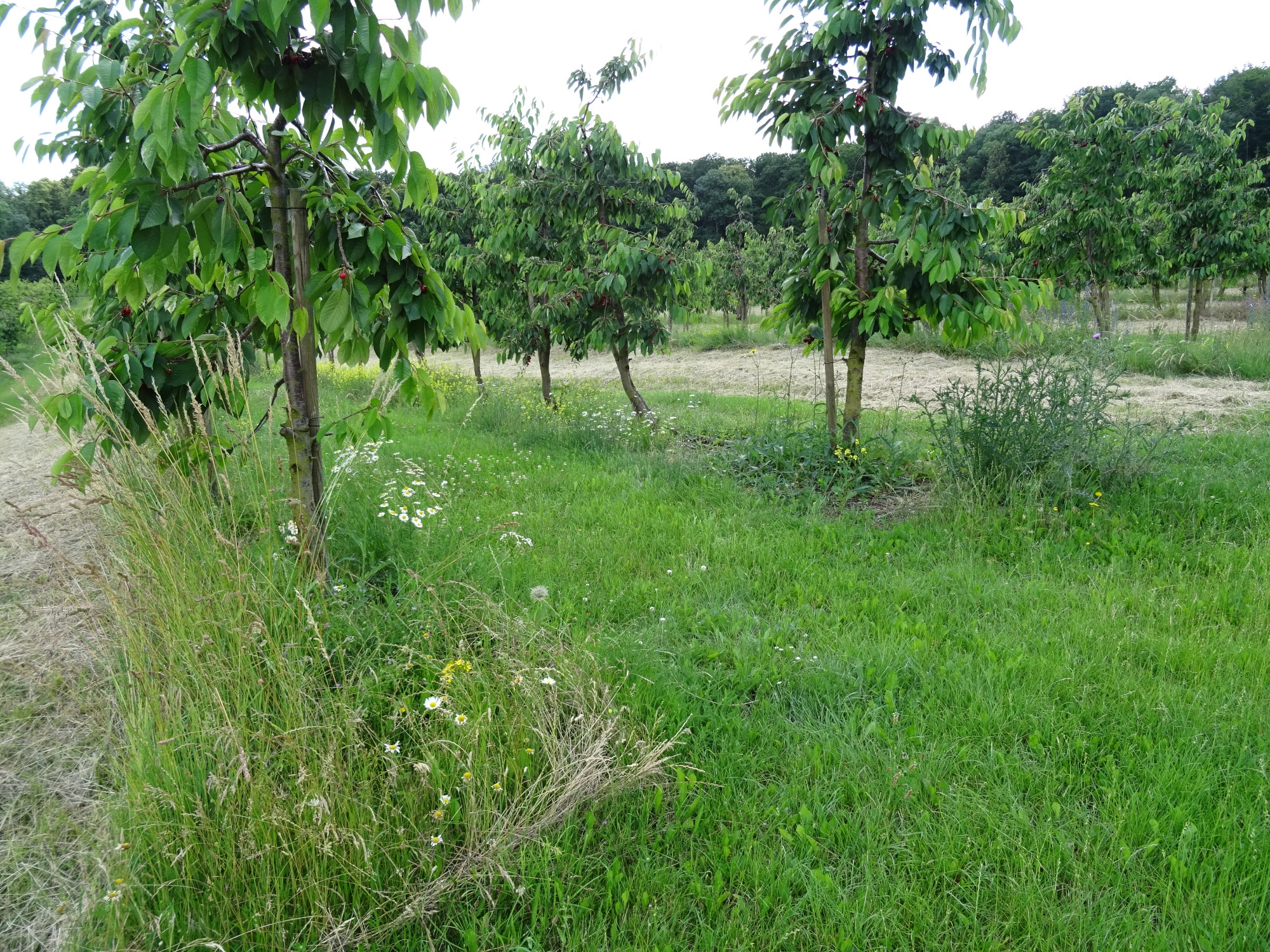 Die Kirschen sind reif und versüßen uns den Sommer. Süßkirschen und Sauerkirschen hängen im dunkelsten rot an den Bäumen. Fleißig wird geerntet und gepflückt. Doch geht man selbst in die Kirschanlagen, kann man sehen, dass unter den Bäumen, am Weg- und Feldrand und in den Fahrgassen so manche wunderschöne Pflanze blüht und den Insekten Nahrung liefert.